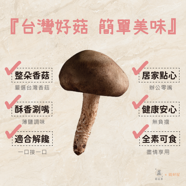 內含鄉菇香黑早冬菇-厚實大菇80克、香濃中菇60g、風味鹽酥菇1包